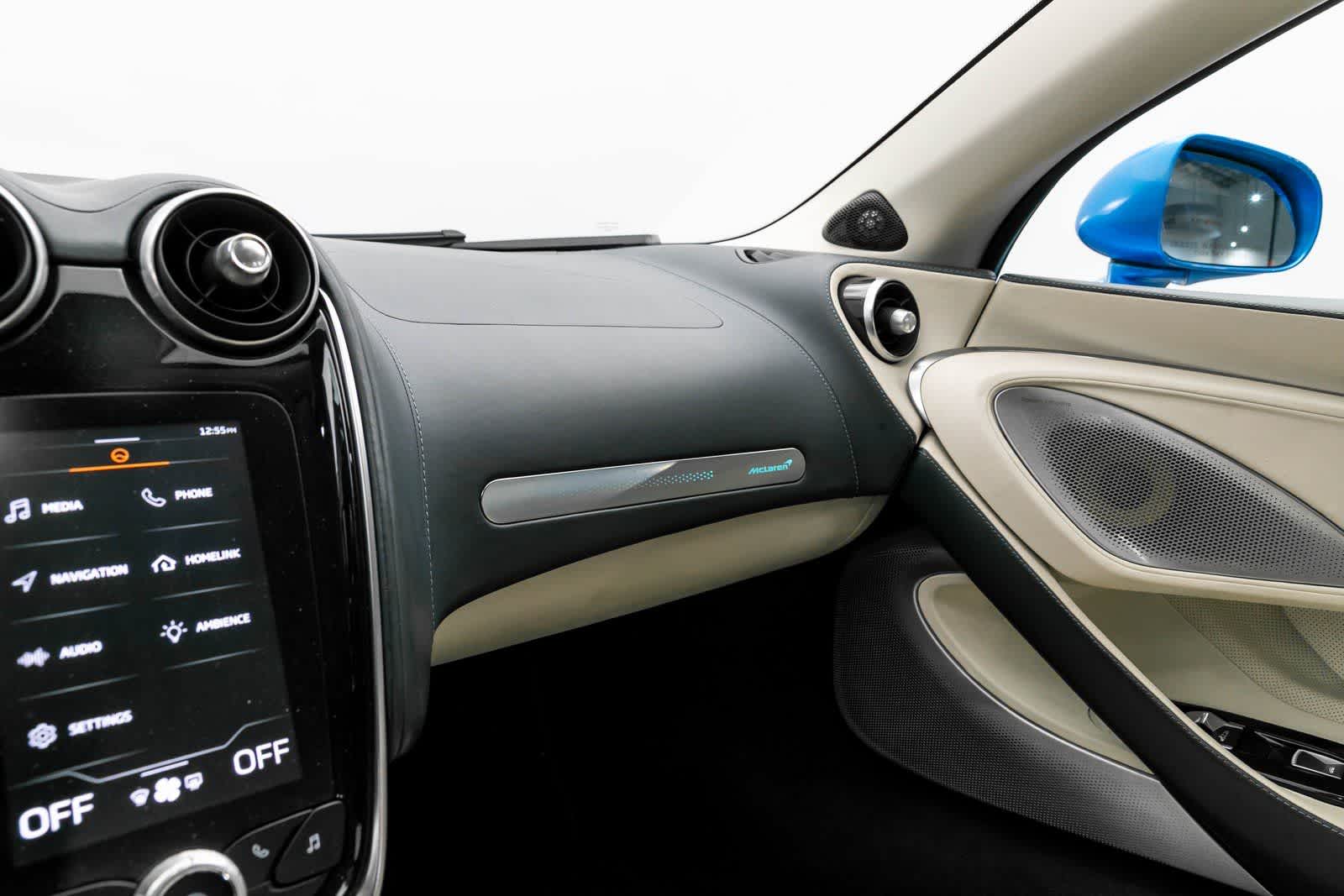 - Radio: AM/FM -inc: McLaren Infotainment System II (MIS II), 7" portrait touch screen monitor w/12.3" TFT instrument cluster, navigation w/cluster turn-by-turn display, on-board memory, audio media player, DAB radio (SiriusXM for federal), Bluetooth® telephony, voice control for infotainment, USB connectivity, aux in, iPod/iPhone integration and McLaren 4-speaker audio system