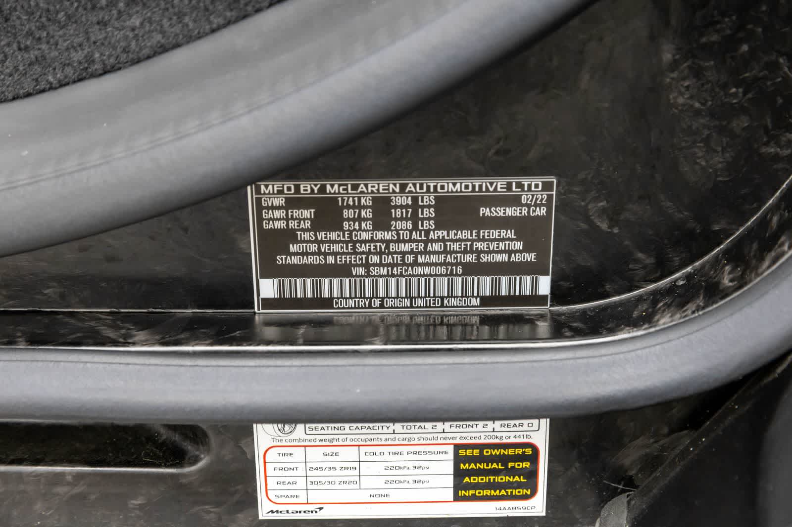 4 Speakers, ABS brakes, Adaptive suspension, Air Conditioning, Alloy wheels, AM/FM Radio, AM/FM radio: SiriusXM, Auto-leveling suspension, Automatic temperature control, Carbon Ceramic Brake w/Red Calipers, Ceramic disc brakes: front and rear, Compass, Convertible HardTop, Dual front impact airbags, Dual front side impact airbags, Electronic Stability Control, Four wheel independent suspension, Front anti-roll bar, Front dual zone A/C, Heated door mirrors, Illuminated entry, Integrated roll-over protection, Knee airbag, Low tire pressure warning, McLaren Track Telemetry w/3 Cameras, MSO Defined Black Pack, MSO Defined Carbon Fiber Hood, MSO Defined Carbon Fiber Rear Aero Bridge, MSO Defined Carbon Fiber Steering Wheel Type, MSO Defined Carbon Fiber Tonneau Cover, Navigation System, Performance Plus Pack, Power driver seat, Power steering, Power windows, Radio data system, Radio: Bowers & Wilkins 12-Speaker Audio System, Remote keyless entry, Sports Exhaust, Traction control, Wheels: 19 Fr & 20 Rr 10-Spoke Forged.