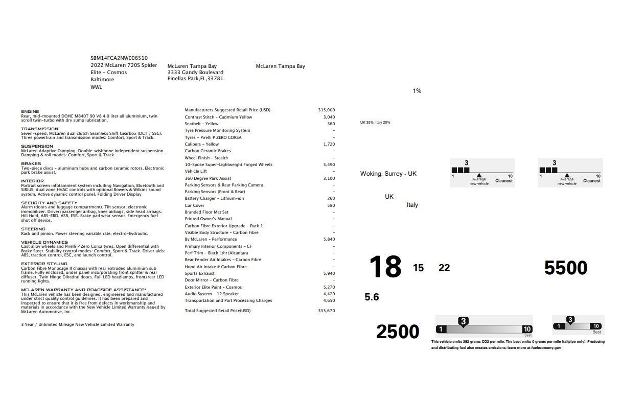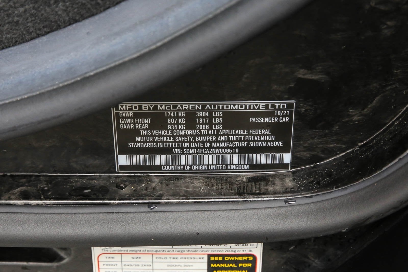 Welcome to McLaren Sterling! For assistance, please contact our Brand Manager, Michael Cramer at (571) 298-6073 or michaelcramer@lithia.com . By McLaren Performance, Exyerior Elite Paint- Cosmos, 360 Degree Park Assist, ABS brakes, Alloy wheels, Black & Xenon Yellow Stitching, Car Cover, Carbon Ceramic Brake w/Yellow Calipers, Carbon Fiber Hood Air Intakes, Carbon Fiber Rear Fender Air Intakes, Compass, Electronic Stability Control, Front & Rear Parking Sensors, Front dual zone A/C, Heated door mirrors, Illuminated entry, Lithium-Ion Vehicle Battery Charger, Low tire pressure warning, Navigation System, Radio: Bowers & Wilkins 12-Speaker Audio System, Rear-View Camera, Remote keyless entry, Sports Exhaust, Traction control, Wheels: 19 Fr & 20 Rr 10-Spoke Forged, Yellow Seat Belts.